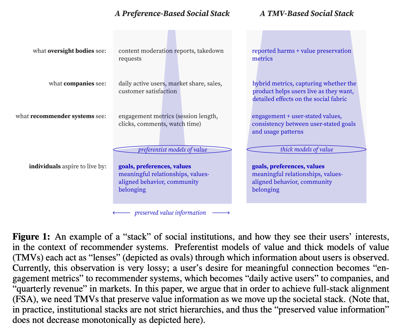 The first paper is “Full-Stack Alignment: Co-Aligning AI and Institutions with Thick Models of Value,” from Joe Edelman, Tan Zhi-Xuan, and collaborators. It escalates the contractualist argument from the level of AI systems to the level of institutions. Even a perfectly aligned AI, the authors argue, produces bad outcomes if it is embedded in institutions that are misaligned with human flourishing. For example, “a user’s desire for meaningful connection becomes ‘engagement metrics’ to recommender systems, which becomes ‘daily active users’ to companies, and ‘quarter revenue’ in markets.”