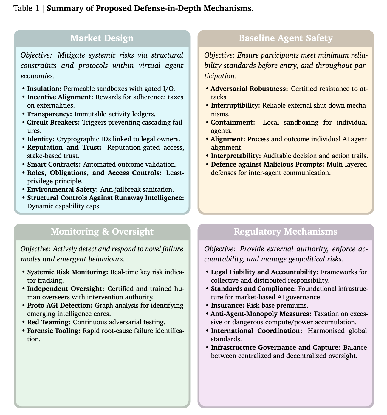 Their proposed framework is a defense-in-depth model with four layers: institutional structures to shape agent interactions, baseline safety requirements for individual agents, active monitoring for emergent behavior, and regulatory mechanisms for accountability.